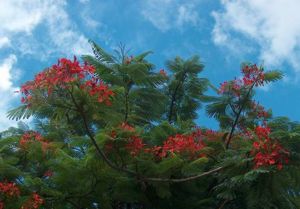 Le flamboyant est un arbre des pays tropicaux originaire de Madagascar qui appartient à la famille des Césalpiniacées. Il se pare de ses magnifiques fleurs jaunes, orangées ou rouges de novembre à janvier à la Réunion et de mai à août aux Antilles.